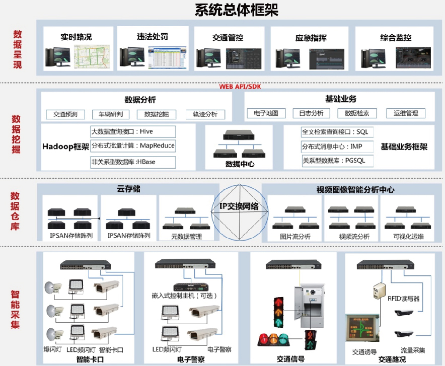 智能交通解決方案由應用子系統、信息服務中心和指揮控制中心三部分構成,致力于為公安、交通等客戶提供一流的智能交通系列產品與綜合解決方案。包括數字交通執法系統、公路車輛智能監測記錄系統、違停智能抓拍系統、城市交通信號控制系統、信號配時及綠波協調優化服務、交通視頻監控系統、交通流信息采集系統、交通誘導信息發布系統以及綜合信息管理平臺等產品。